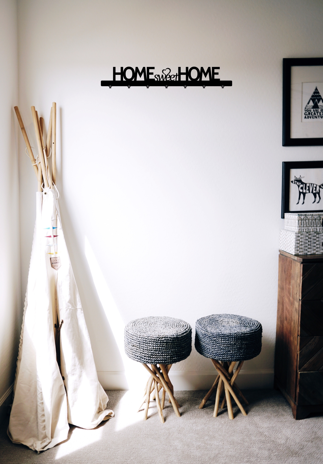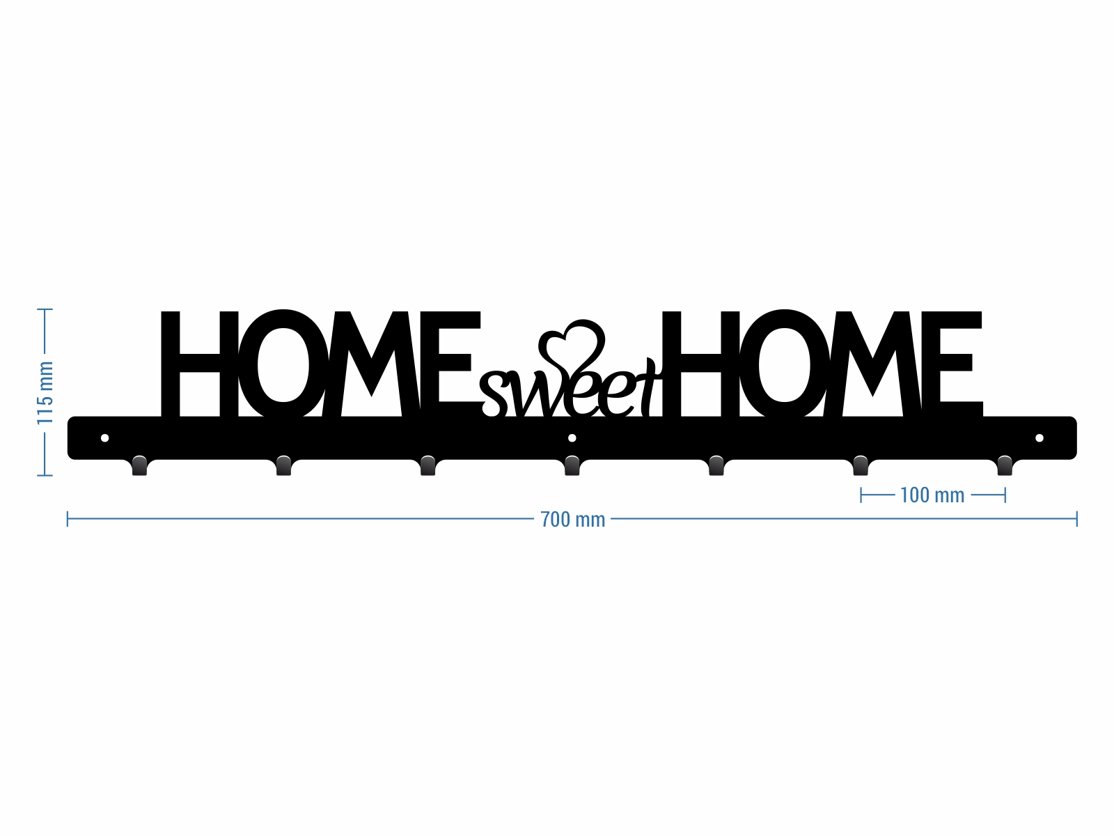 Dekoracyjny ścienny wieszak na kurtki z 7 haczykami na ubrania. Jego całkowita szerokość wynosi 70 centymetrów. Ten model, ozdobiony pięknym napisem ‘Home sweet home” jest idealny nie tylko do przedpokoju!