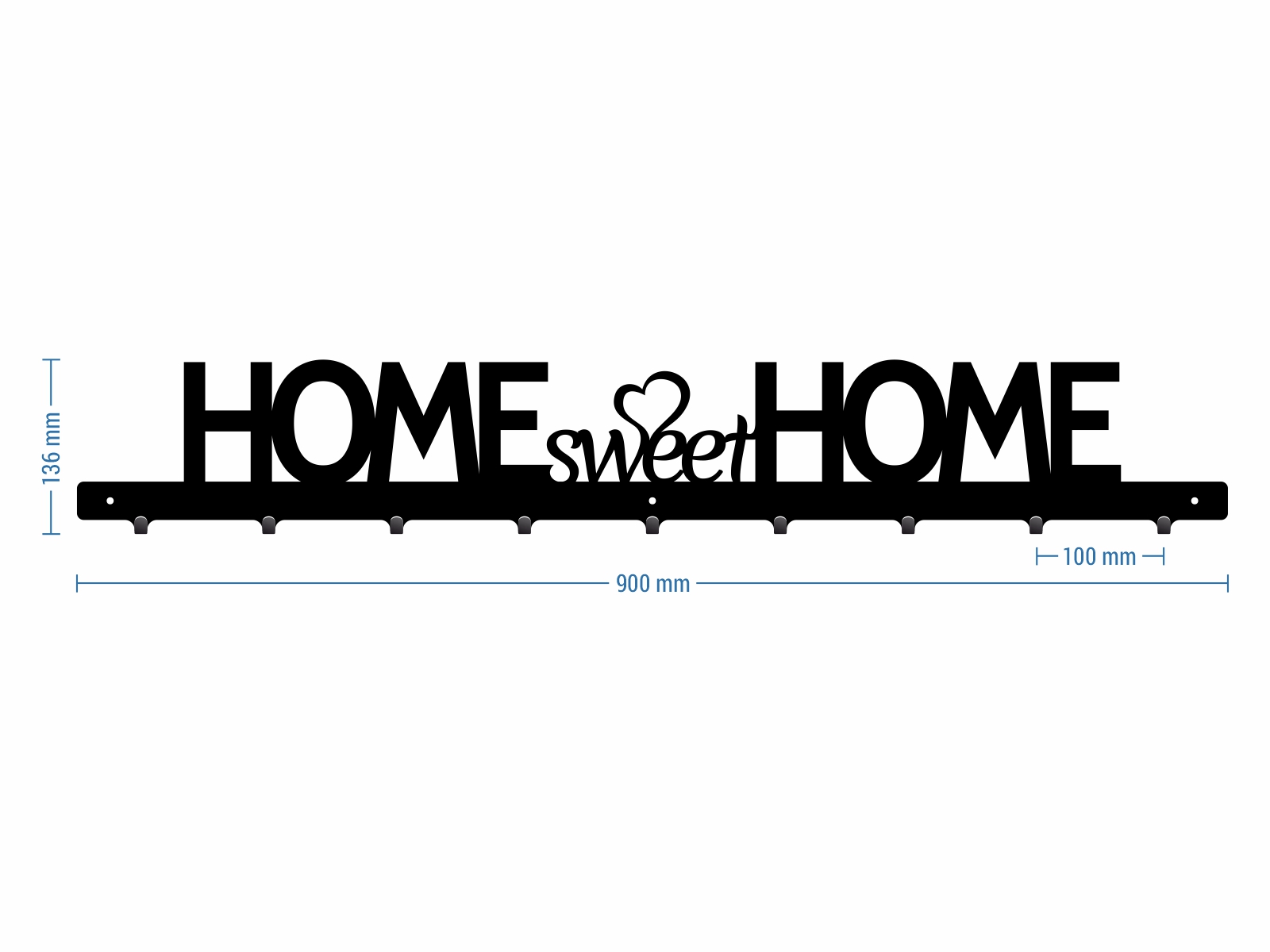 Dekoracyjny ścienny wieszak na kurtki z 9 haczykami na ubrania. Jego całkowita szerokość wynosi 90 centymetrów. Ten model, ozdobiony pięknym napisem ‘Home sweet home” jest idealny nie tylko do przedpokoju!