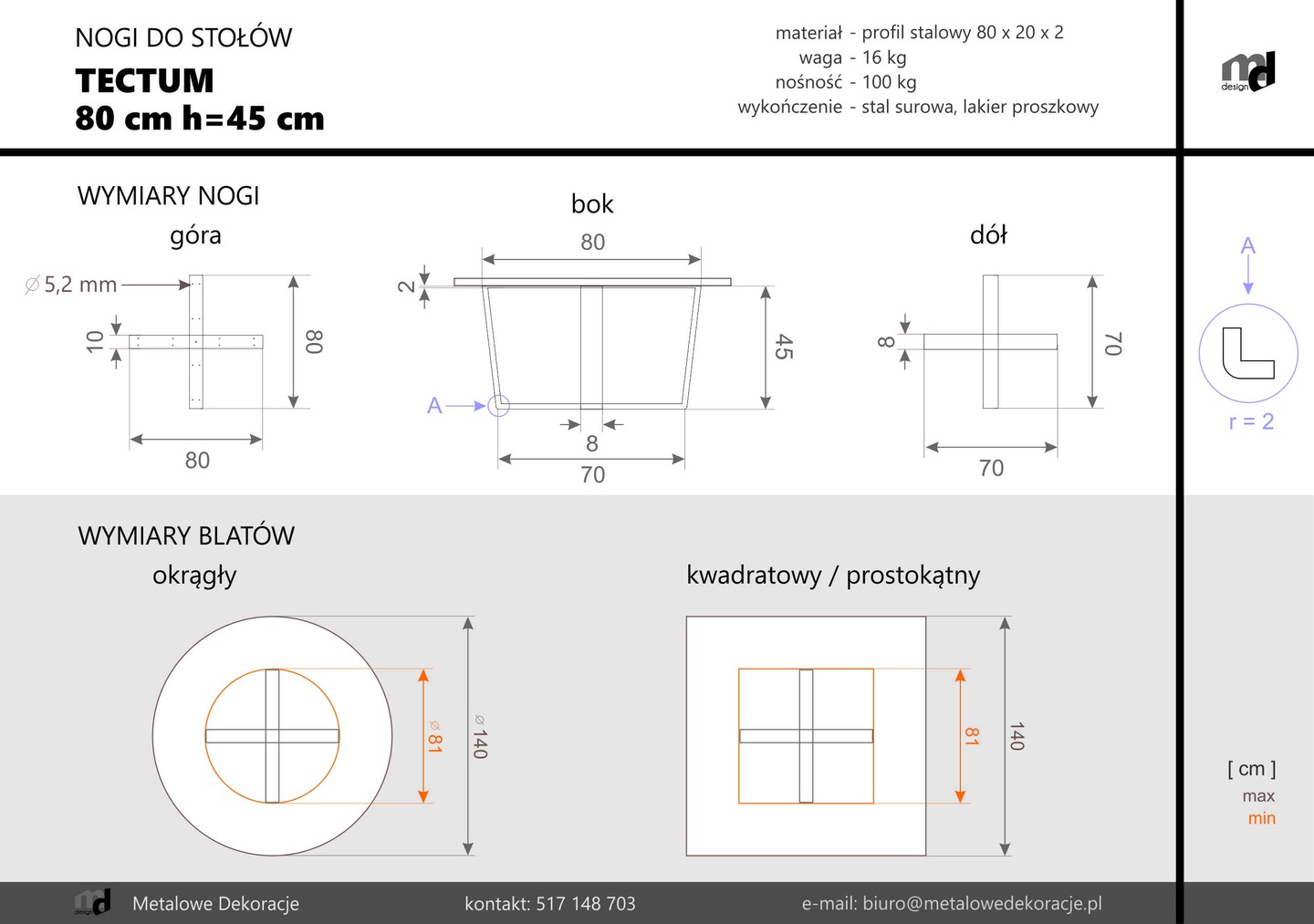 Do you need a table base that stands out for its modern yet timeless design? You just found her! The metal leg for the Tectum L table is a great choice if you appreciate contemporary design and universal elegance. Its height is 45 cm. The diameter or length and width of the top to the Tectum L base should be between 81 cm and 140 cm. Tectum is a model made of 80×20 mm steel profile and designed for wooden or board tabletop.